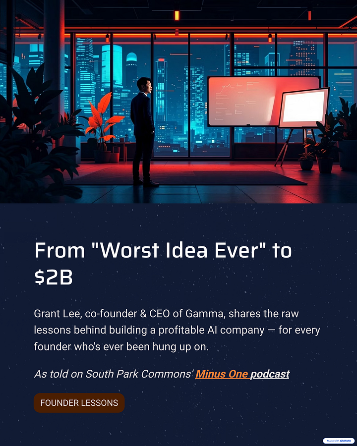 Grant Lee, cofounder and CEO of Gamma, joins South Park Commons GP Jonathan Brebner to share how the "worst idea ever"—an investor's words before he hung up—became a $2B AI unicorn taking on PowerPoint and Google Slides.