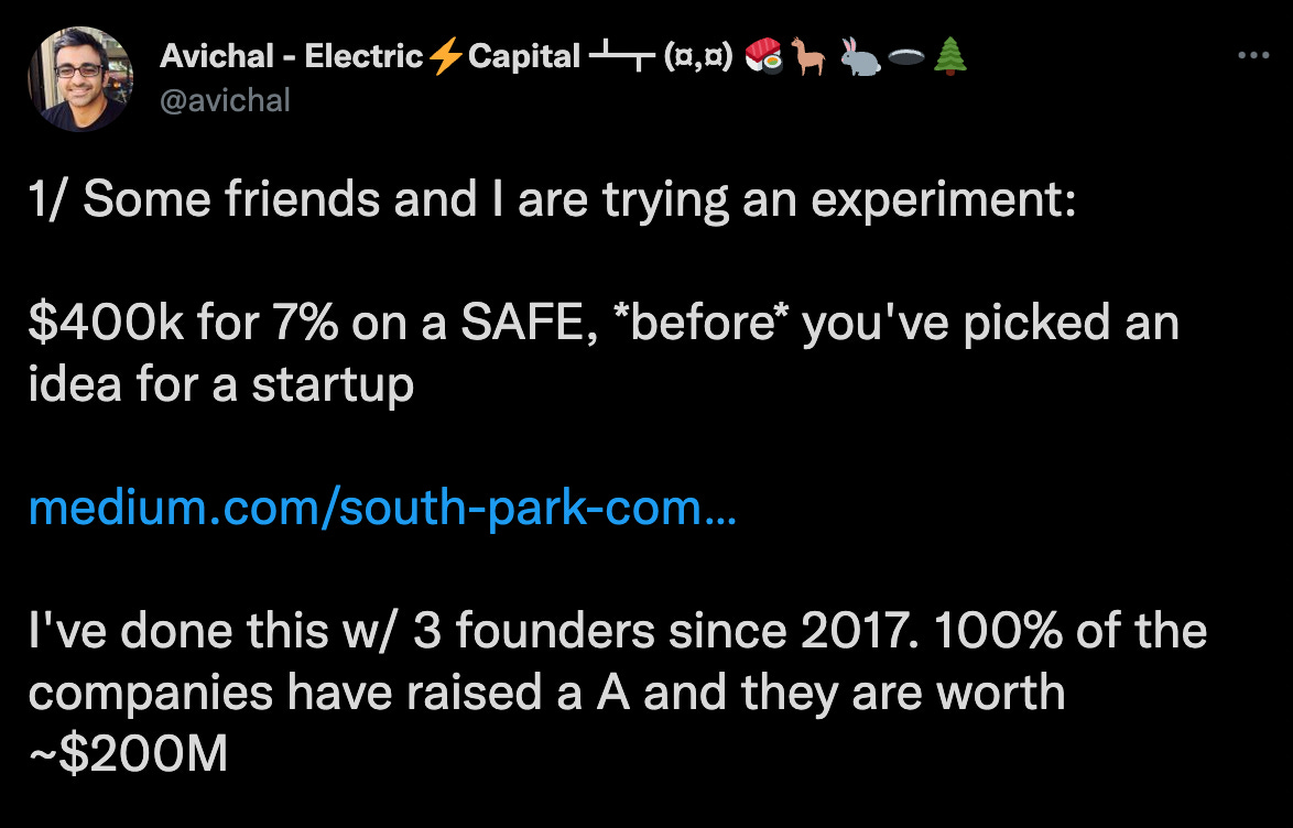 Twitter has many downsides, but exposure to randomness is a clear upside. The idea of someone investing $400,000 before I had an idea was insane, but also a perfect fit for where I was at in my career.