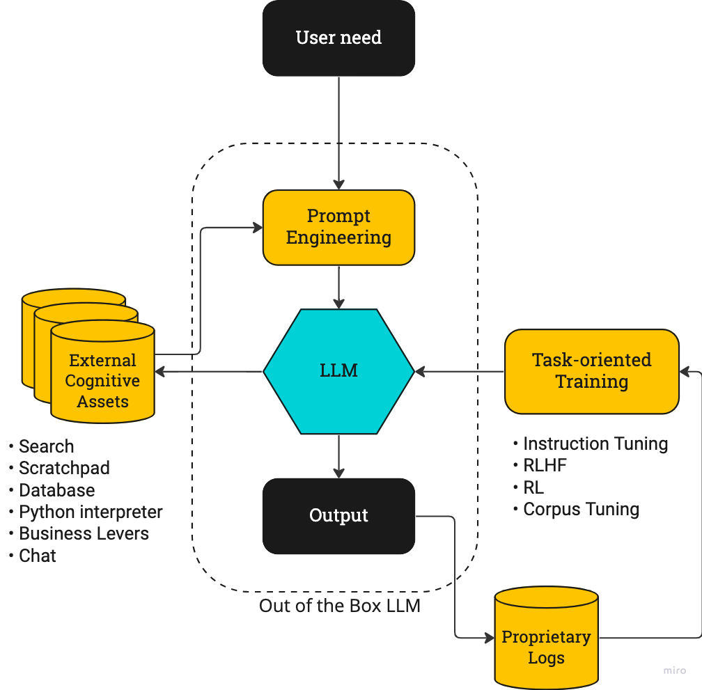 On the left we have the External Cognitive Assets that can supercharge a model’s power. These can be any function that takes text as an input and provides text as an output, including searches, code interpreters, and chats with humans.