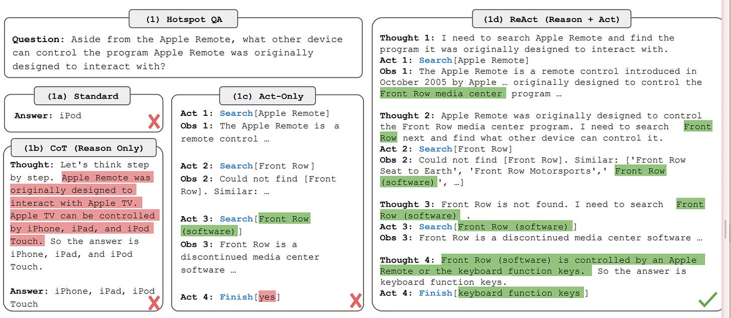 Here, the main actions the model uses above are Search and Finish. The authors also provided Lookup action that can search within the text of the article. In 1a/1b we can see the LLM doesn’t do very well answering the question on its own, because it doesn’t have enough information. In 1c we see that simply giving the algorithm a search function is not sufficient because the model seems to forget what it is doing by the time it hits the end. The authors’ approach of including both actions and specific thought steps is able to search deeply and find the answer.